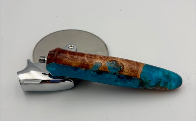 Pizza cutter with a resin and red mallee burl handle. The cutter is stainless steel, and the handle is removeable so that the cutter can be easily cleaned. This is one beefy pizza cutter that will make a statement in your kitchen.