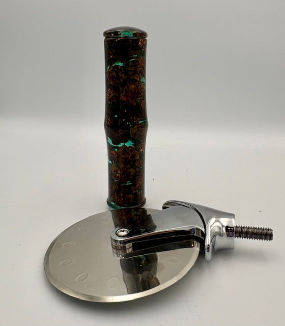 Pizza cutter with a resin and pinecone handle. The cutter is stainless steel, and the handle is removeable so that the cutter can be easily cleaned. This is one beefy pizza cutter that will make a statement in your kitchen.